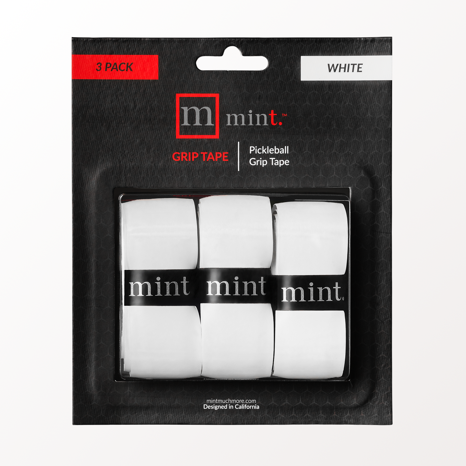 Pack of white pickleball grip tape with 'mint' branding on a black background