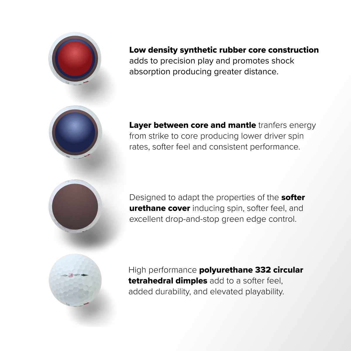 The innovative four-layer urethane design, including a softer hitting feel and better durability, brings a longer flight distance and more stable trajectory. The 332 circular tetrahedral dimples ensure your ball maintains its course from tee to green.