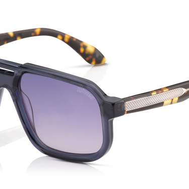 The Model 12 Blue Havanna brings a more relaxed, lifestyle-driven feel to this bold silhouette. The Jinliang acetate blends cool blue tones with warm tortoiseshell flecks, creating a sense of movement and depth that feels effortless rather than loud. The wider frame shape gives Model 12 its confident presence, while still sitting comfortably as a balanced, unisex fit. Integrated acetate nose pads keep the lines clean and easy to wear throughout the day. Gradient CR-39 Category 3 lenses soften bright light and add a calm, easygoing visual tone. A removable slingshot hinge with silver detailing adds a subtle technical edge, finished with deep laser-filled silver tip accents. Blue Havanna feels laid-back but considered — ideal for everyday wear with a little extra character.