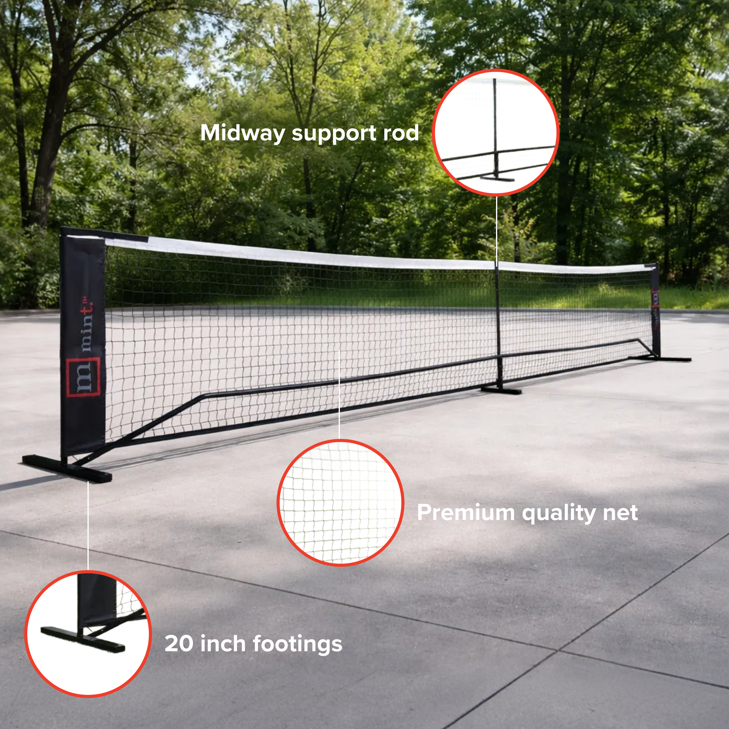 • All-Weather, Heavy-Duty Net: The reinforced 15-ply polyethylene (PE) net features enhanced tear resistance and durability, with side mesh reinforced by robust PVC. Adjustable tension straps and a fiberglass center pole maintain the perfect net height and prevent sagging, even during intense play.