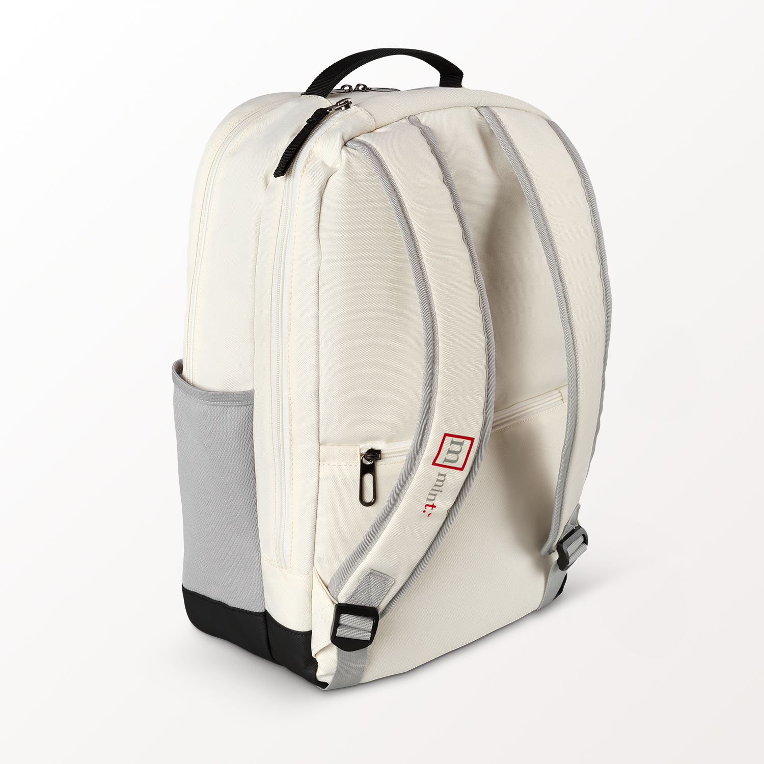 White backpack with features highlighted on a red background, featuring the brand 'mint'.