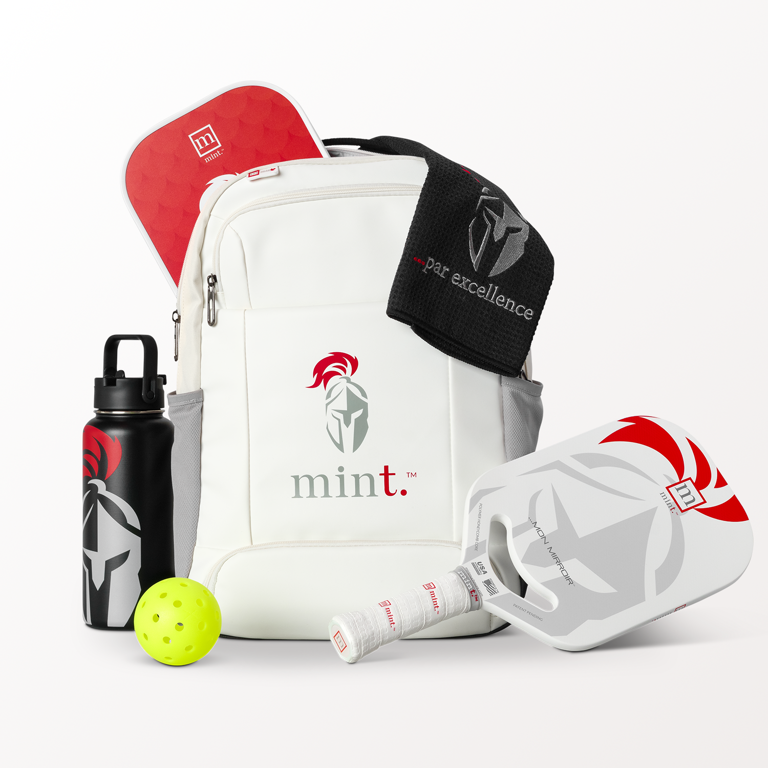 Pickleball paddles, ball, and accessories with 'mint.' branding on a white background